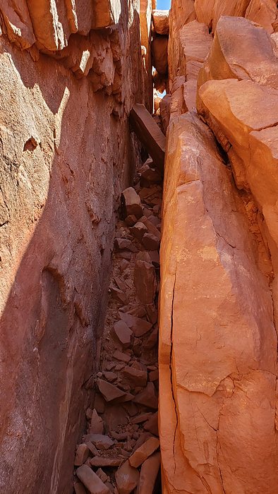 potential route here....but I had an issue with rock slab in the middle. It was wedged by only 1/2 inch of contact and was worried it would slip if any pressure was applied. Being underneath it really did not want to mess with the slab
