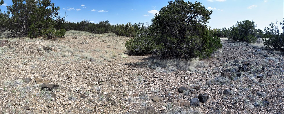 No pottery because ruin #3 is not a ruin, it's a ballcourt! (Hard to capture but this is looking down the long axis of the oblong dip with tree growing in the right center). I think the pottery concentration we hit just up hill from here (not near a ruin) must have been the tail-gating site.