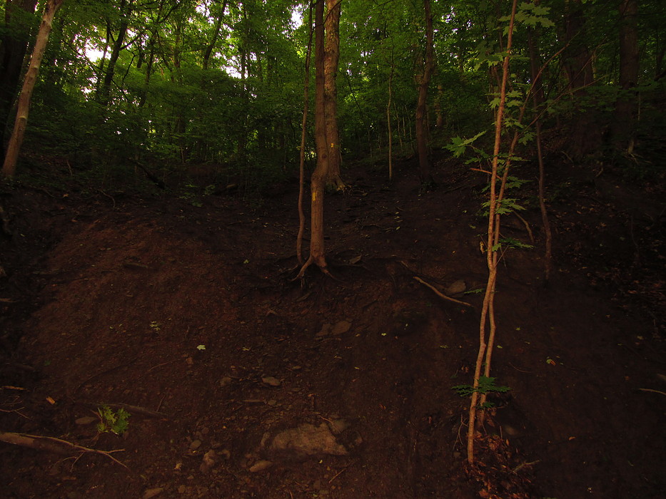 This is the trail, no switchbacks in PA. You can see the two yellow blazes on the trees to mark the trail. It was harder to hike down than up. The rocks and roots are where you need to keep your footing. The recent rains made this very muddy and slick, adding another layer of difficulty to the already incredibly steep terrain.