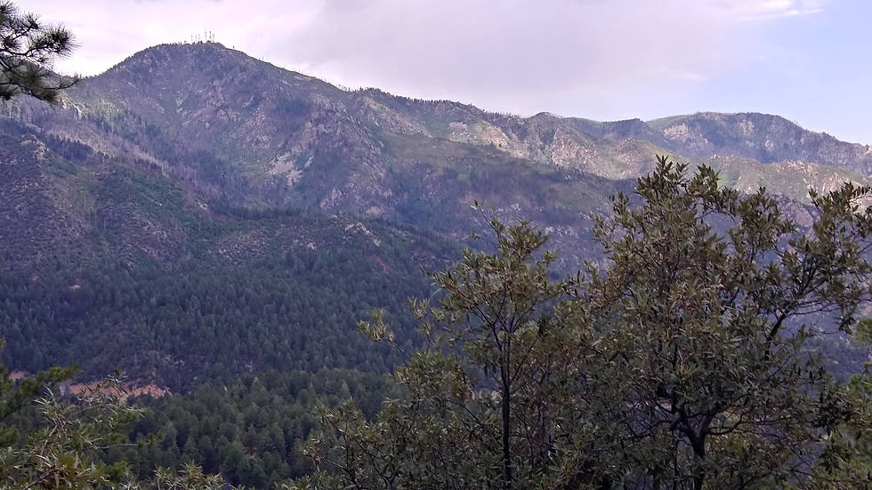 Best I could do with a cell phone. View of the area I just finished hiking earlier in the day. Heliograph Peak on left, Eagle Rock where the Arcadia Trail crosses the ridge in center photo. The upper Saddle is where the old Trail supposedly crossed over.