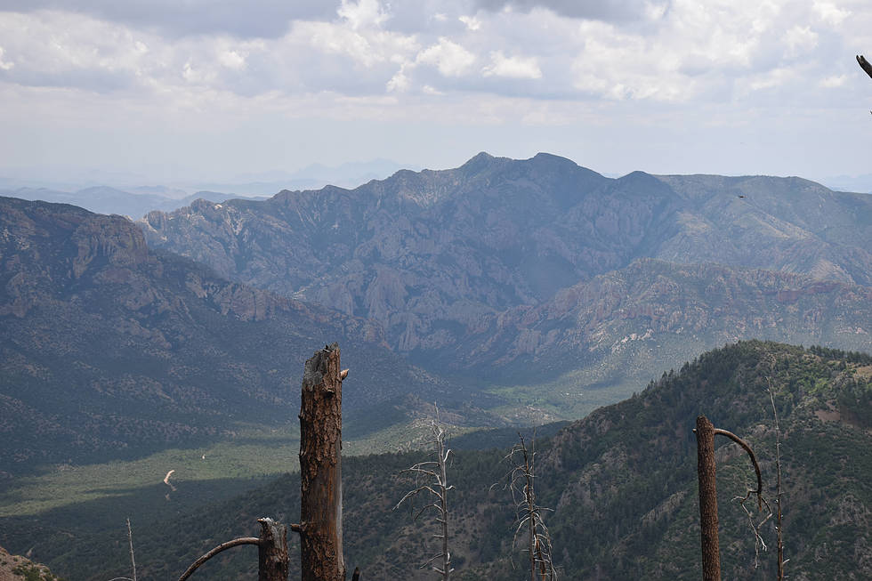 View to East, Cave Creek below. Cave Creek makes a turn down that rocky Canyon. Portal is at the mouth of Cave Creek. I believe that high peak is Portal Peak.