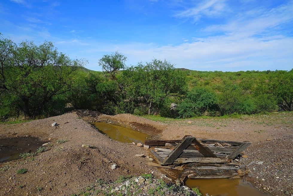 People were driving around the corrals and cutting thru the back of the property to the continuing road on the backside of the Cerro Colorado. The rancher put up some pipe fencing stopping that. Then they made an unofficial road out the back side of a campsite cutting across the wash to get to the backside. Then the rancher bermed this side and dug out this moat. Now the quad riders are building a scrap wood bridge. I didn't see any recent tire tracks though.