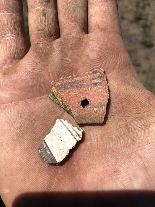 Found on top far away from the dwelling was an abundance of pottery, my first time seeing a deliberate drill hole through a piece, the other side of it shows more so how the hole truly appears to be purposefully done and crafted even with my skepticism of it being unintentional or naturally occurring.