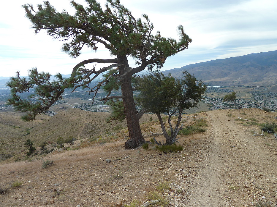 Howl at the Moon GZ? You can see just how windy it normally is by looking & the shape of this tree's branches. Notice the trail in the background, the trail I came up before coming to this tree. P1080025