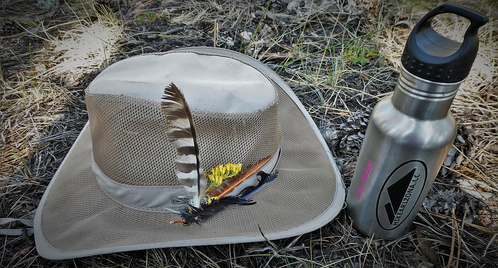 Break time. I had picked up a couple more feathers on our hiking. I found this hat at Glacier Park. Tracy and Shawn liked it so much, they got it too so we have matching hats. They are awesome for hiking in the heat as your head stays very dry.