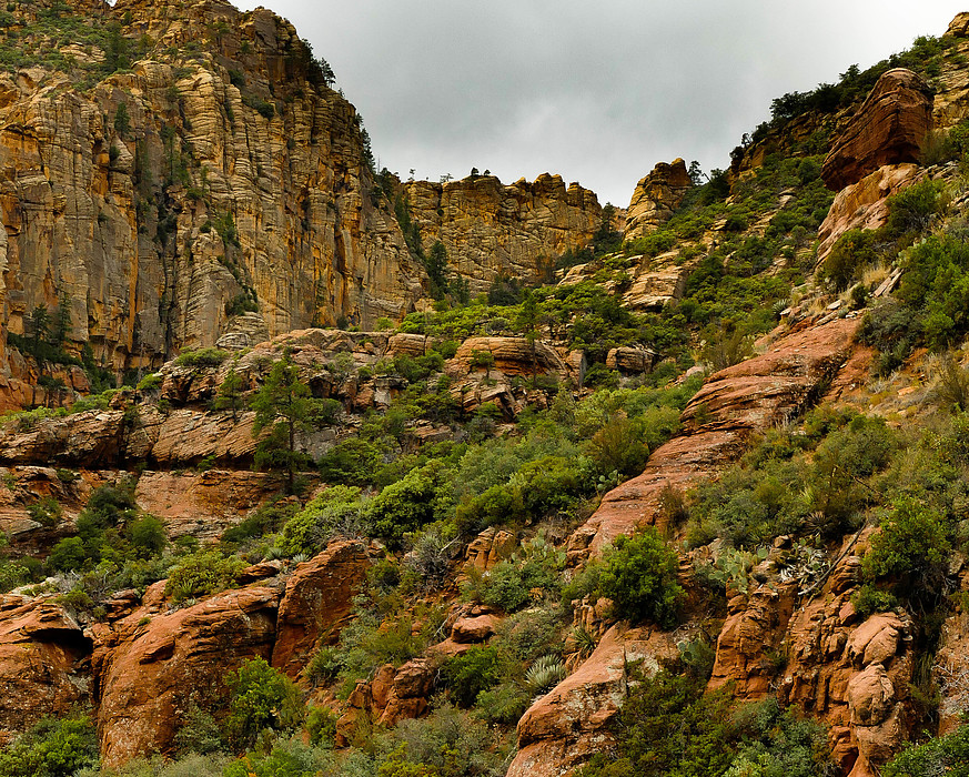 Sedona features many mountains, the four most mentioned being Wilson, Capital Butte, Munds and Bear. One can view those with relatively short drives on paved roads. Maroon mountain here, a name I venture rarely mentioned, stands tall and broad on the west side of Secret Canyon, as I descend from the David Miller saddle. This view requires a four wheel drive and/or a good hike on less known trails.