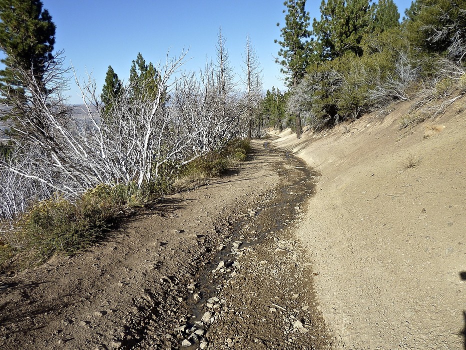 20º; 7,288' elevation; trees on left burned, OK on the right. Heading down the trail. P1080136