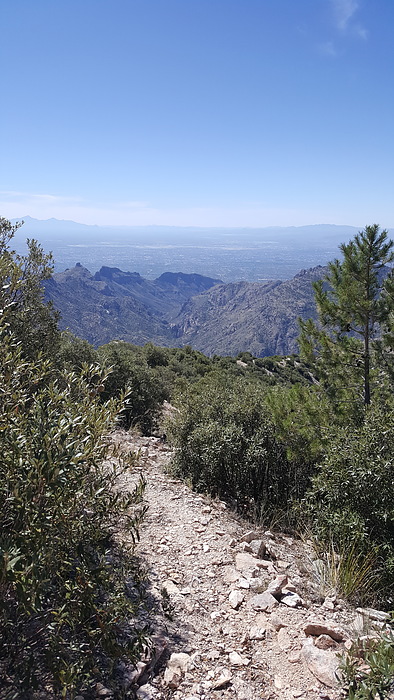 South-southwest view down into Sabino Canyon from the Box Camp Trail. From here the trail goes down hill fast, on a number of levels.