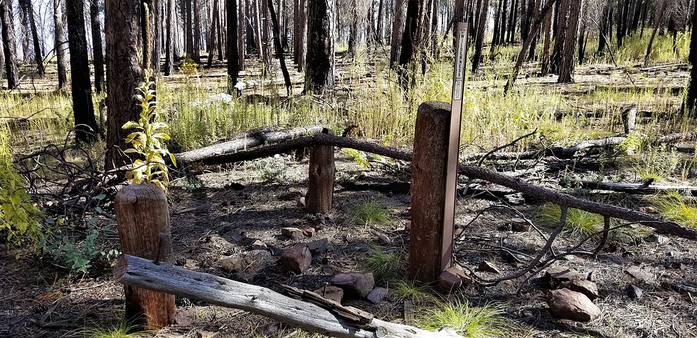 The posts, set into the ground, with a 4th having the remnants of an old trail sign.