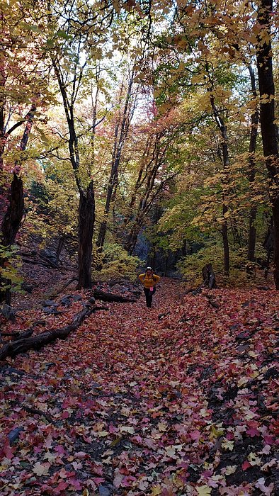 Kathy making her way through the leaf jungle