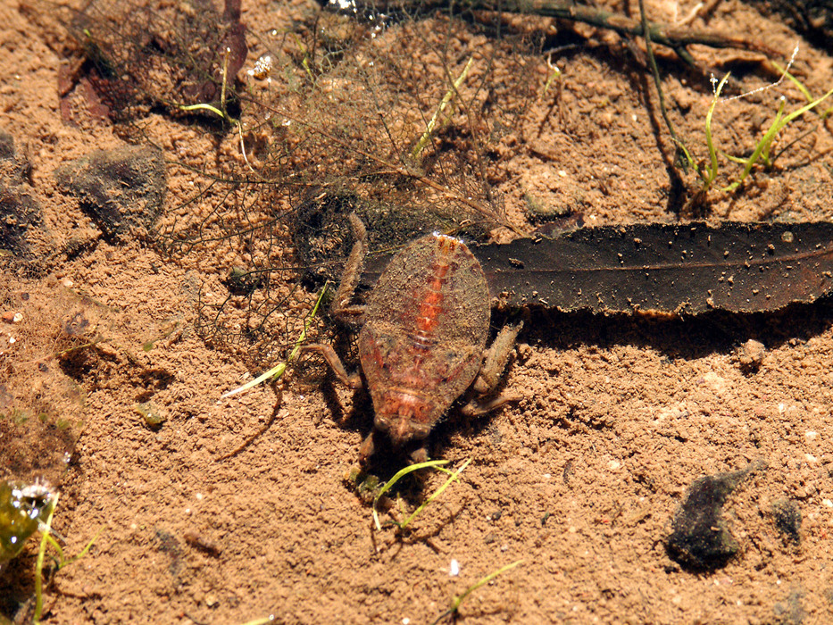 Water bug under about an inch of water, note the decaying leaves