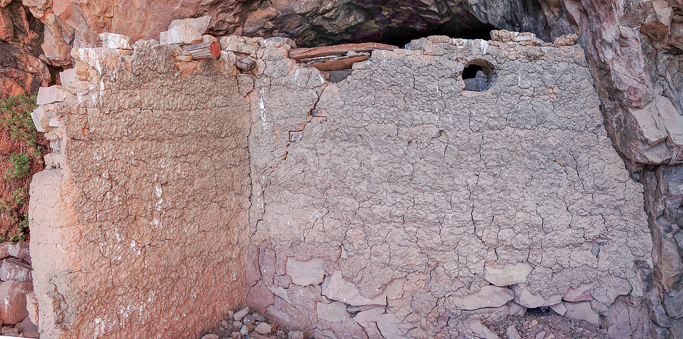 There appear to have been three rooms large enough to be living areas extending back into the cave. The walls of the outer most room had crumbled to the ground because the walls were exposed to the elements causing the adobe mortar between rocks to be washed away by rain. The two walls in the photo were part of the the middle room and still have the ends of a couple of rough beams stuck in the left wall. The two holes in the back wall may have held larger roof beams.