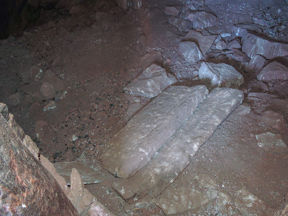 The two large slabs shown in this photo are wood and were laying just inside the door to the inner most room. The slightly cupped indentations on the surface may have been from a stone axe used to shape the slabs. These were not mentioned in the archaeology report, Echoes in the Canyon. My first thought was that they formed a door but they also might have been the top covering of small burial crypts for dead children in the floor of this room which had been dug up by pot hunters. Note: These wood slabs were laying at this same location in the photos from my Oct 2012 visit to this site.