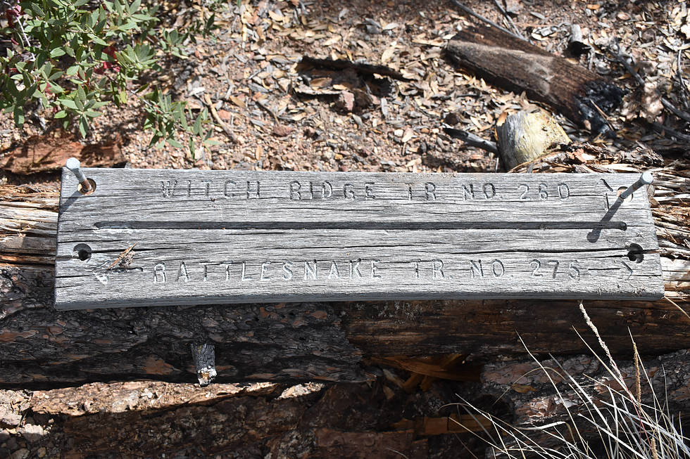 Sign at Rattle Snake, Witch Ridge Trail junction. I stopped to eat lunch here in a small clearing, when I got done eating I found this sign under some brush. I put it on this log to get a picture and so others could find it. This was an omen as to the condition of the trail. This sign shows the Rattlesnake Trail going up then over the other side of the ridge to Rock Creek.