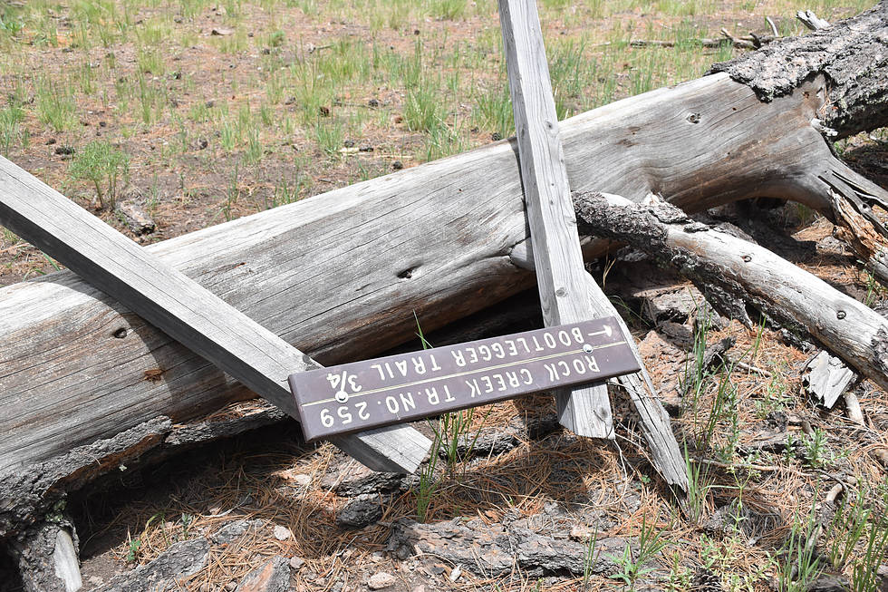 Sign at Bootlegger Saddle. This sign indicates this is the Rock Creek Trail and the Bootlegger Trail is .75 miles down.