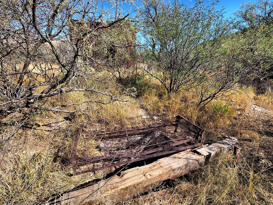 old well site, water about 20 feet down, good use of old bed springs to prevent animals from falling in, empty more recent tin shed in background