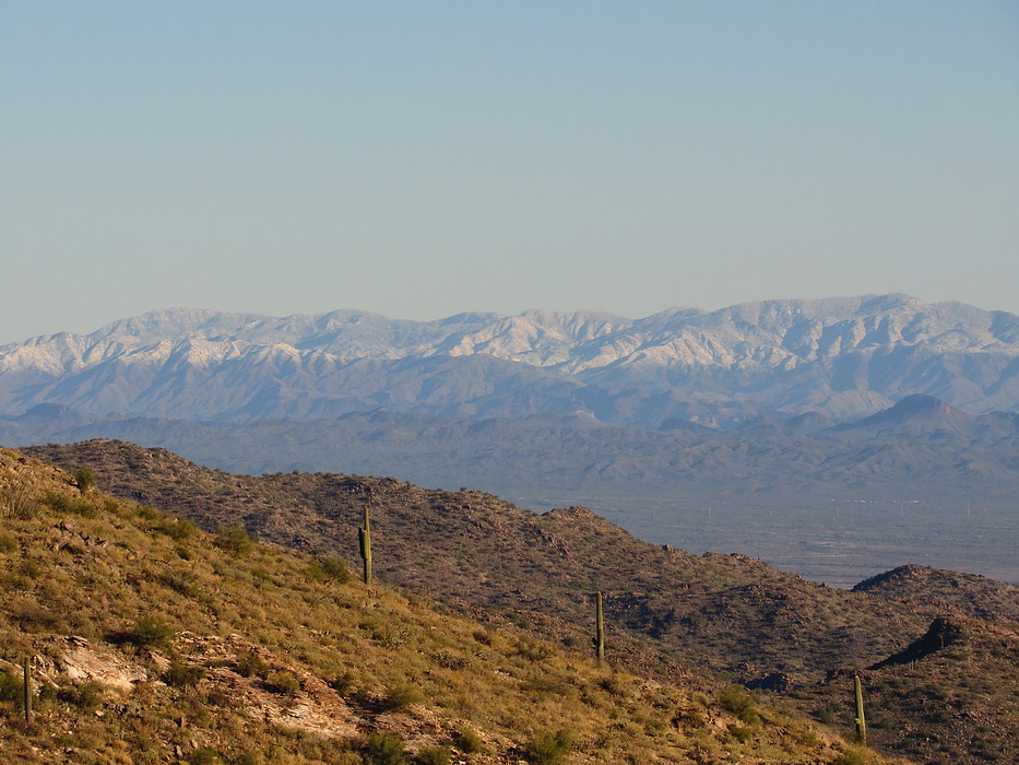 Views just over the saddle at the top of Goat Camp. Snow line very prominent early in the day.