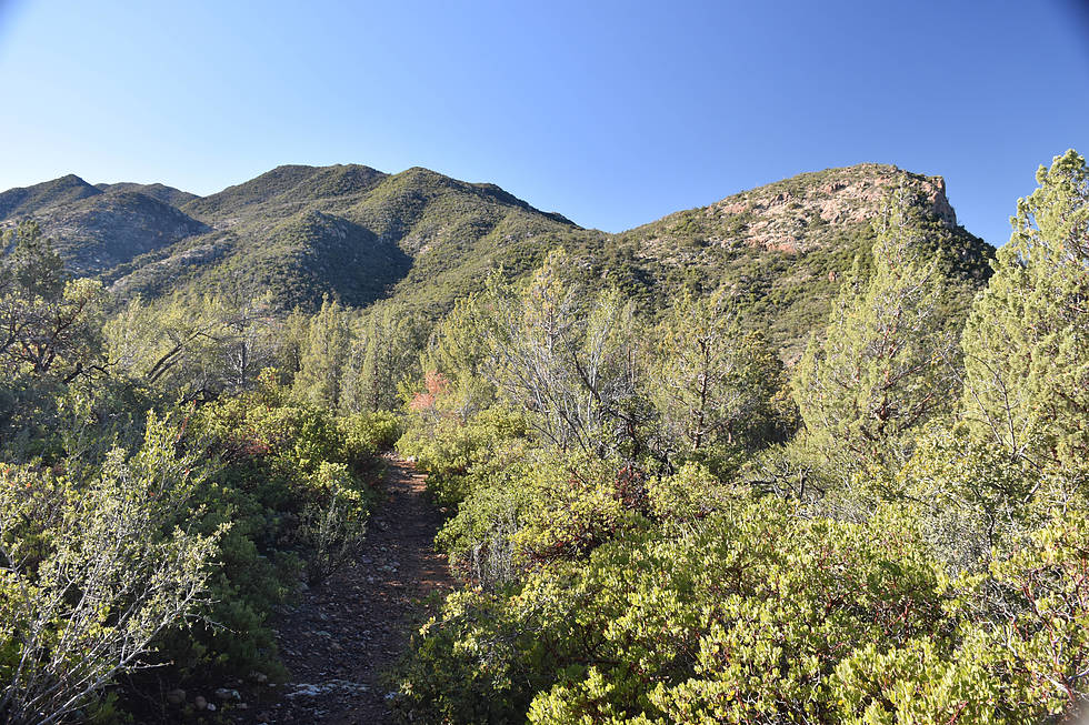Up on the first ridge and entering Bull Basin. From this point the trail is a little bit overgrown but not bad. The bad part was there was still dew on the plants and by the time I got to the saddle I was a bit wet. The temps were in the upper 40's low 50's so when I took a break at the saddle the sun felt good but just the slightest breeze and it was cold. I know I'm a wimp.