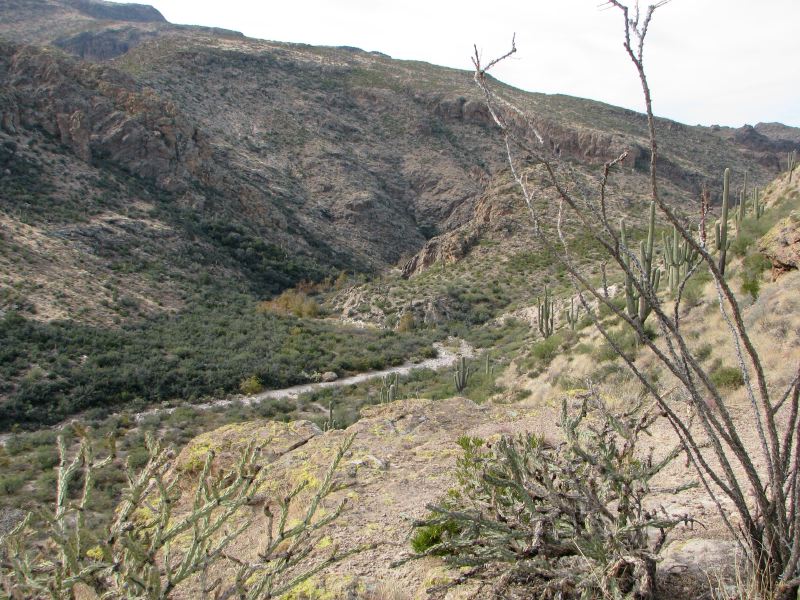 The saddle we climbed up is at the center right. Mescal Spring is on the far side of the butte at center right.