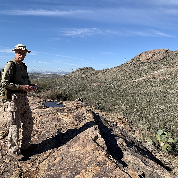 Destination of the RidgeView Trail. The valley to the right is the Detatchment Fault that runs along Tanque Verde Ridge. The Ridge I am standing on is the hanging wall of the fault or the portion that slid down as the ridge was rising.