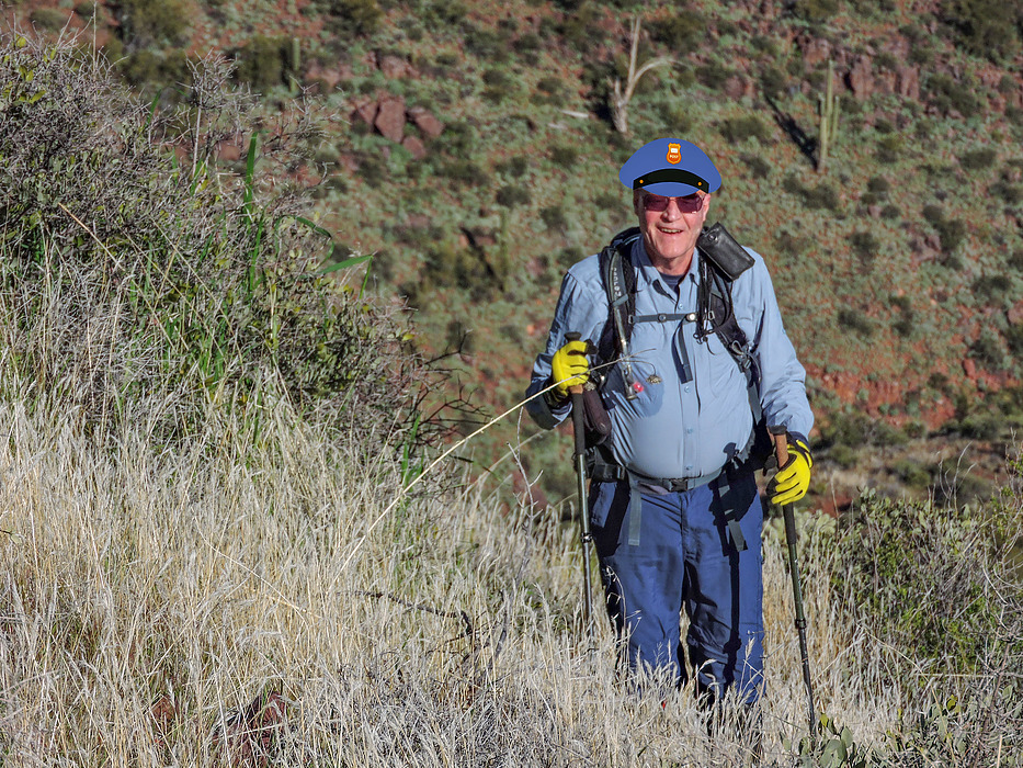I made the comment to GH that his blue attire made him look like a postman. He's known for his large collection of head wear and quickly pulled this postman's hat out of his pack. "Neither snow nor rain nor heat nor quest for ancient Indian Ruins stays this courier from the swift completion of his appointed rounds."