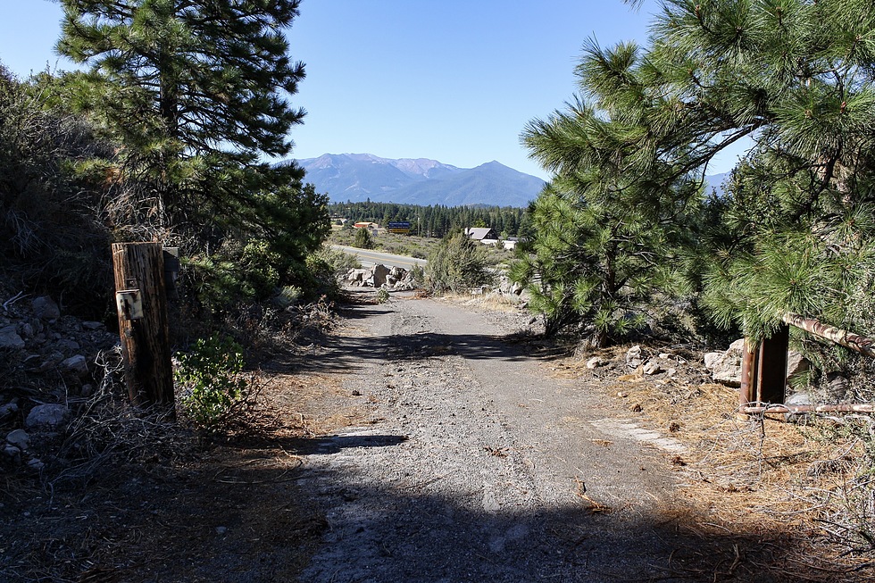 Looking back towards Weed. The modern alignment can be seen just below the buildings in the center. The buildings are actually on Big Springs Road.