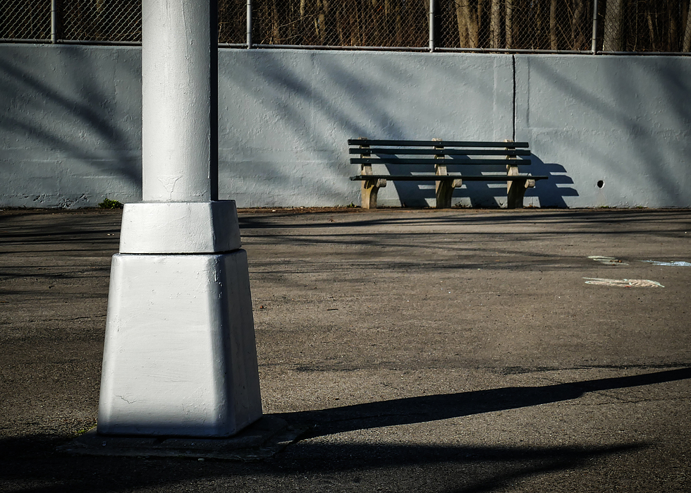 Typical city park/playground. Here empty in virus times. Aesthetically simple, gritty. But sturdy and serviceable. This snippet of the park, taken for a bit of drama, is part of a large park with swings, basketball hoops and playground equipment. But this captures the gritty functional ambiance.