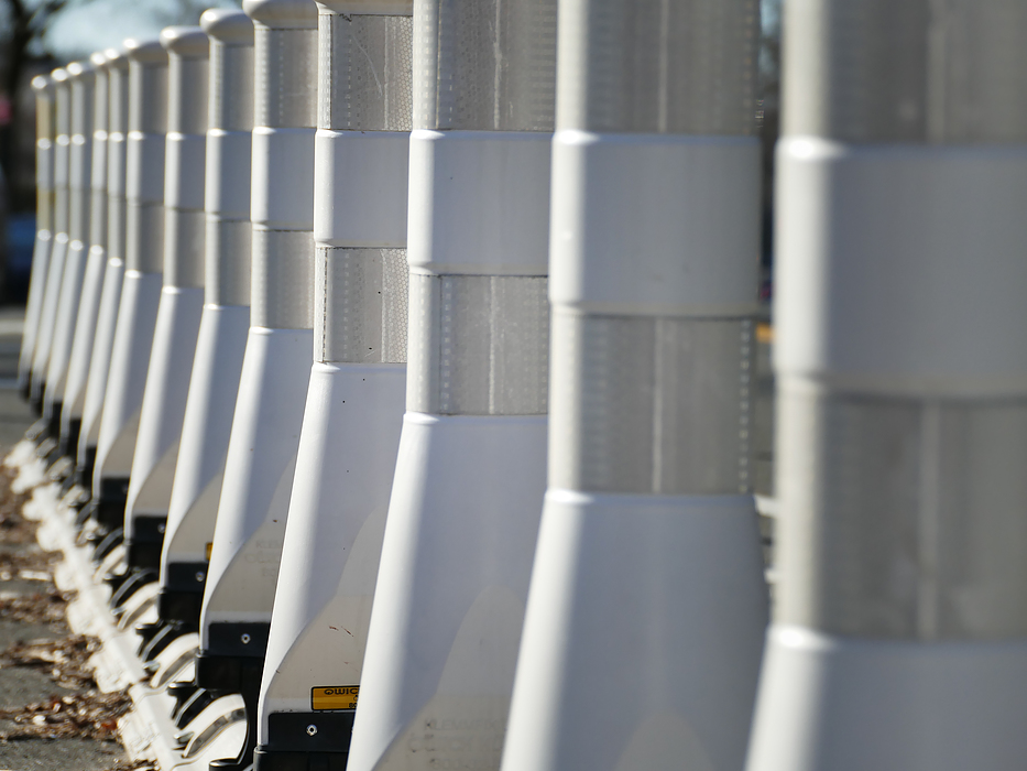 Traffic barricade. This is near a school. People would make U-turns as they picked up their students. Not a good thing. So the whole street system was redesigned to improve safety. These barricades help direct and restrict the traffic to prevent accidents, or worse, hitting a grade school kid.
