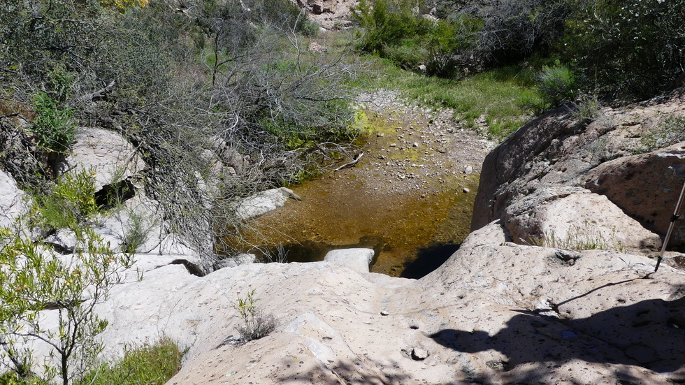 The pour-off where we had to decide... climb up to the right and across a ledge before dropping back down, or back up a bit, ascend along a game trail... and then I stepped on a rattlesnake!