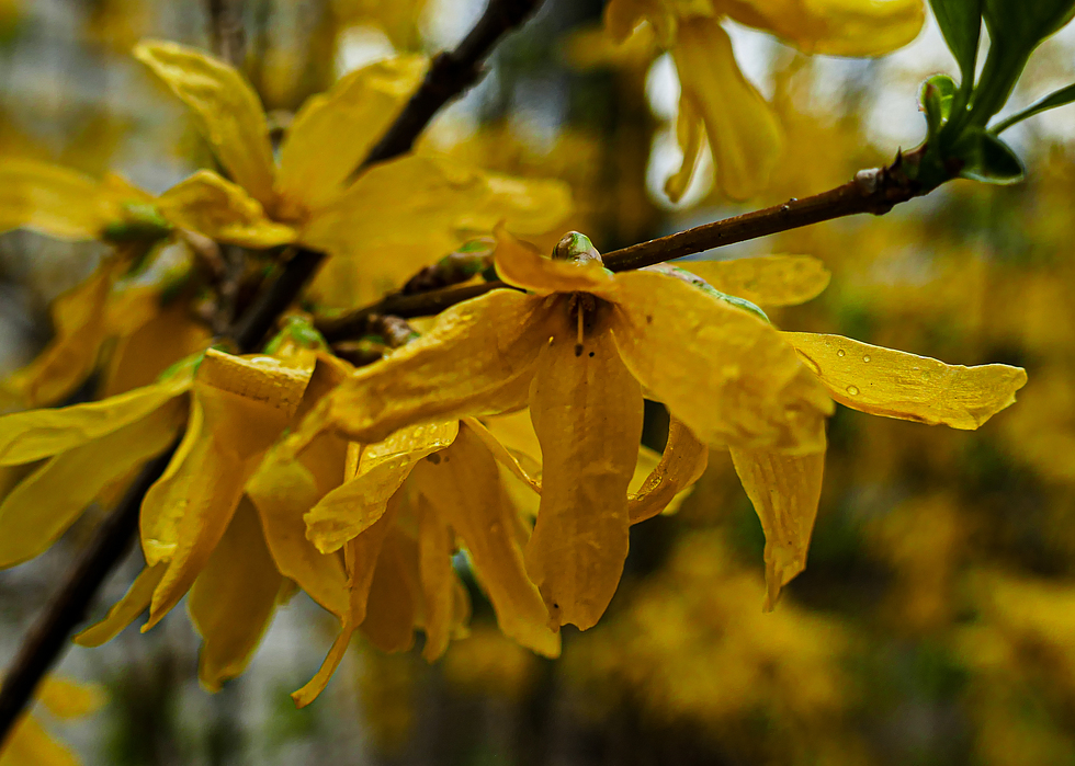 A Forsythia flower. Caught here just after a light rain, so small droplets sit on the petals. Small somewhat scraggly flower. Note the identification comes not from anything I know but from a downloaded app. The app provides pictures of what it thinks the flower is, so I am able to do some comparison of the apps pick of a flower type to my picture.