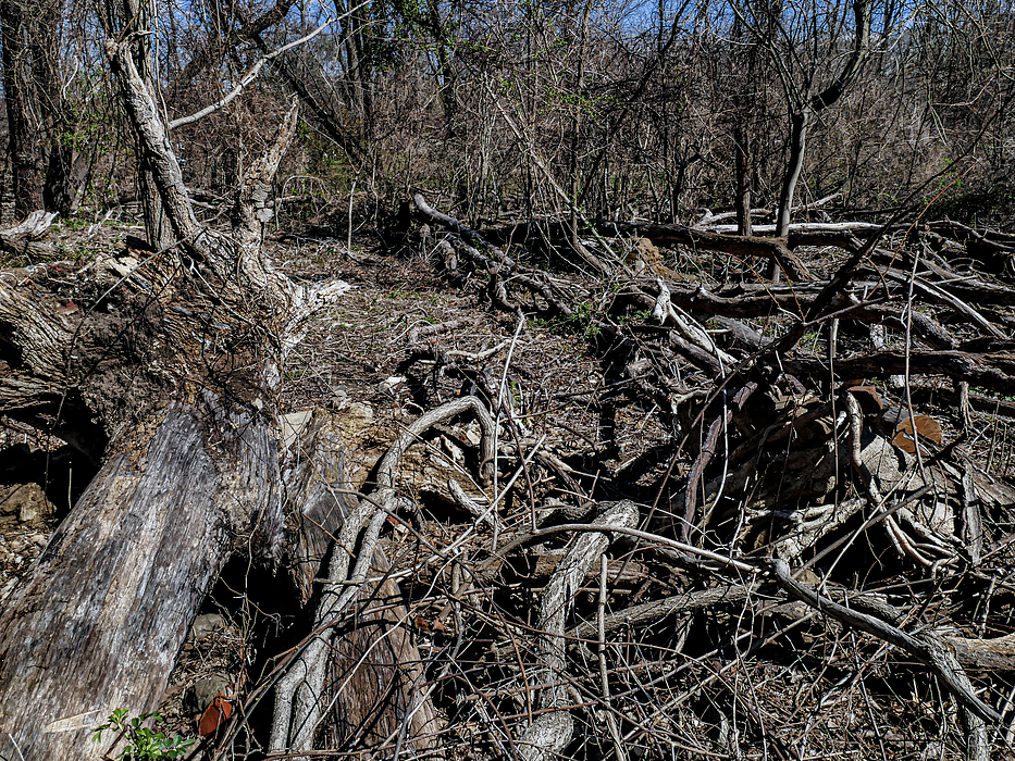 More tree fall. Some of this, while appearing to be tree limbs, could actually be the thick growth a invasive and strangling vines from the East Pacific. Note the rather thin roots on the large fallen trunk, a problem leading to wind fall. In a balanced forest, trees with weak roots can regenerate the forest quickly, but evidently the natural order should follow with sturdier trees.
