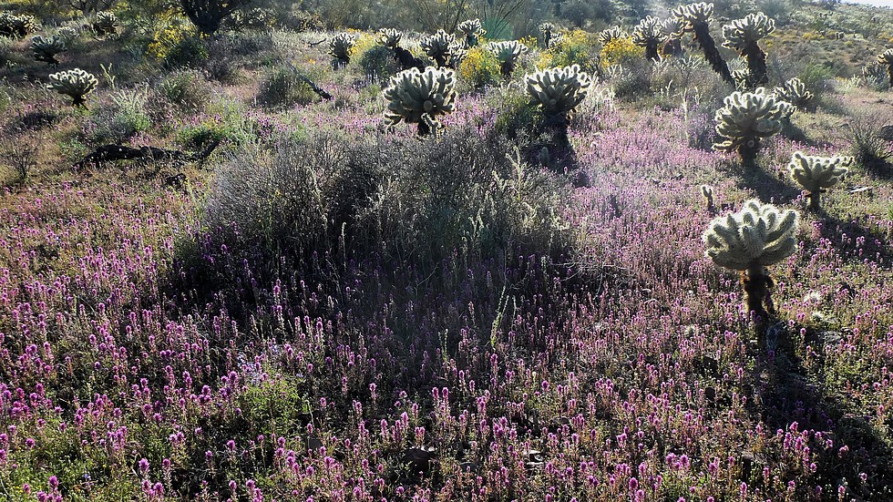 back to the highside of the Ridgeback trail looking over the owl clover and chollas with some scattered brittlebush.