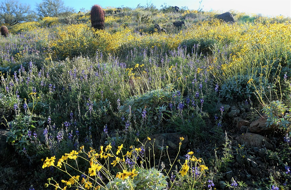 looking on the high side (south) of the Ridgeback Hill at the brittlebush blooms and lupine with some scattered SW/Compass cactus.