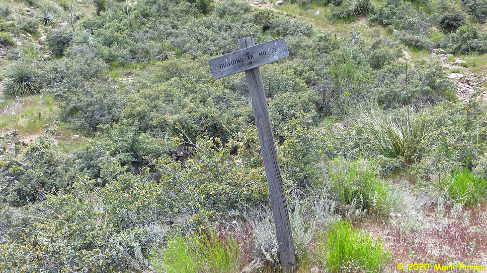 Diamond Trail #76 is marked on FS maps as the trail leading to Indian Spring Peak. That said, it is a bit weird because not only is the location of sign not where shown on the map, it leads away from Indian Spring Peak. We followed to see where it lead but it faded to nothing within 1/4 mile.