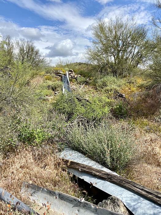 Flume sections moved around where it looks like it crossed a creek. Possibly a big flood in the past.