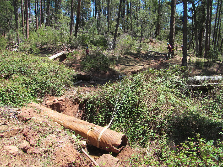 We tried several approaches to move the culvert--pulling on it from three different directions before it budged. It was full of dirt and at least one large rock "cork" that plugged it. The Conservation corps women were down almost inside it with rock bars breaking up the dirt so we could scrape it out.