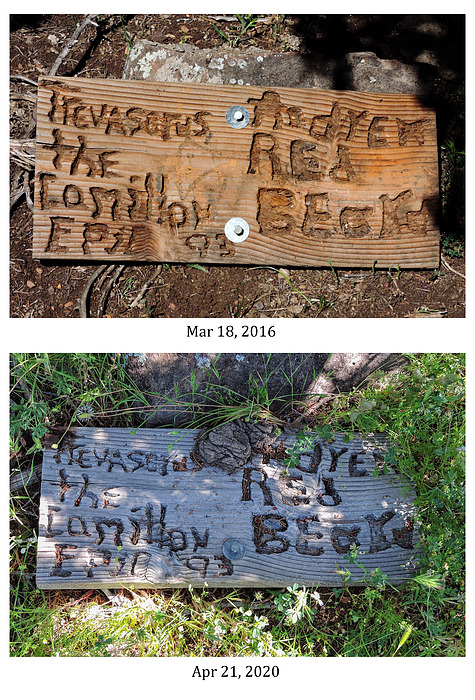 Found this sign laying in the grass under a juniper tree right where @Grasshopper and I had left it on a hike back in 2016. It has weathered a little and some cow had no respect for it. The meaning of the words engraved in this thick plank was a mystery back then and still is. But some recent searching on Google has led me to think that it is referring to an on-line video game, Trove, and a "fan-run community website" for that game called Trovesaurus. I'm waiting for an expert's opinion. He's my grandson who has been an avid on-line gamer for years and will be getting his masters degree in computer science in May.