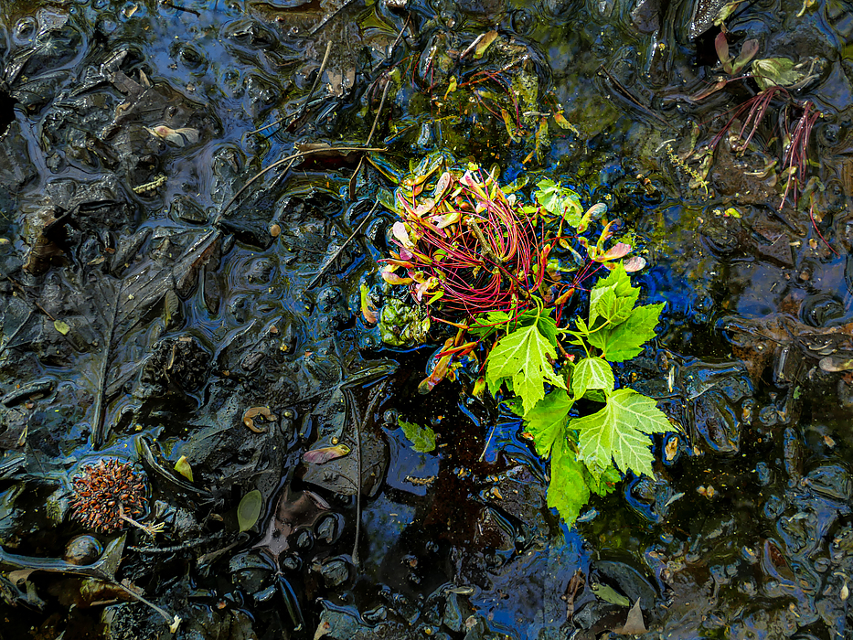 A bit of a jarring contrast here. The bright green and red appear to be from a "swamp maple," having fallen into a sort of oil-like bog. This might be freshly fallen, as to the upper right the bog has in effect swallowed up prior fallen leaves