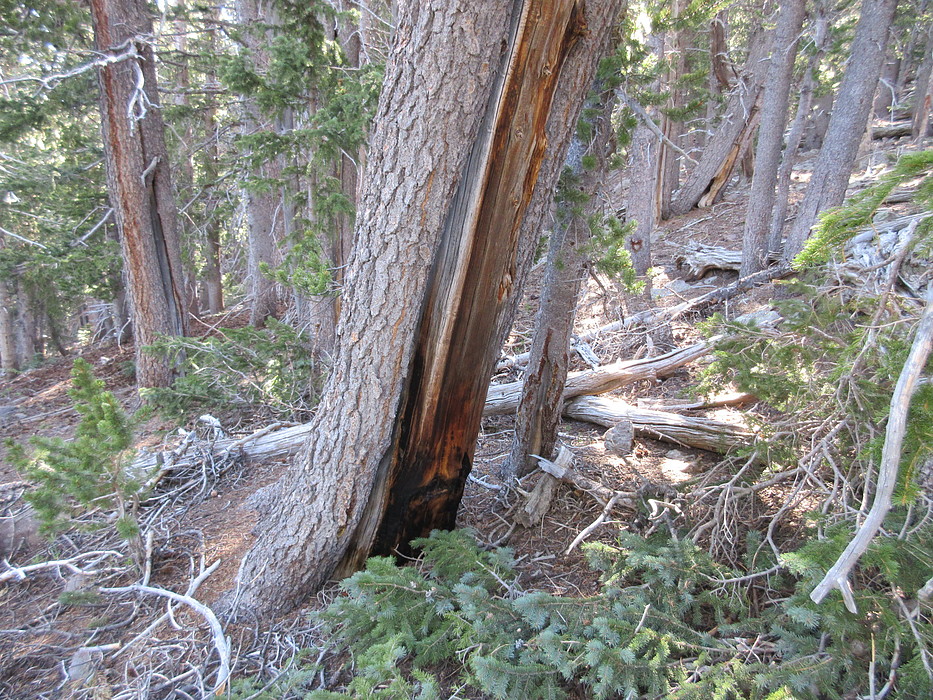 Along the ridge extending out to Schultz Peak, lots of mutliple fire scars on the old bristlecone pines. This is consistent with the south slope east of the saddle between Agassiz and Peak 11673. The obvious char indicate the damage was fire related, and not animal. Spruce and fir have seeded in over the last century, and this was destroyed by the 2022 Pipeline Fire, but the warm upper slopes of the Peaks had bristlecone forests 150 years ago that resembled ponderosa in many aspects. Note the thick duff buildup in the stand. When this burned in 2022, it did so very hot and upslope, with a strong head-wind, and therefore was an intense crown fire. It is very, very, very unlikely that this was the natural or pre-1900 fire regime for these slopes of Bristlecone Pine on the San Francisco Peaks.
