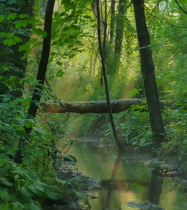 The light pushed through openings in the tree cover to create these sun beams of golden orange. Nice reflections in the creek water. And the fallen tree created a dramatic horizontal against the standing trees. I was just lucky to see this, as on a different day or different time this view wouldn't be like this.