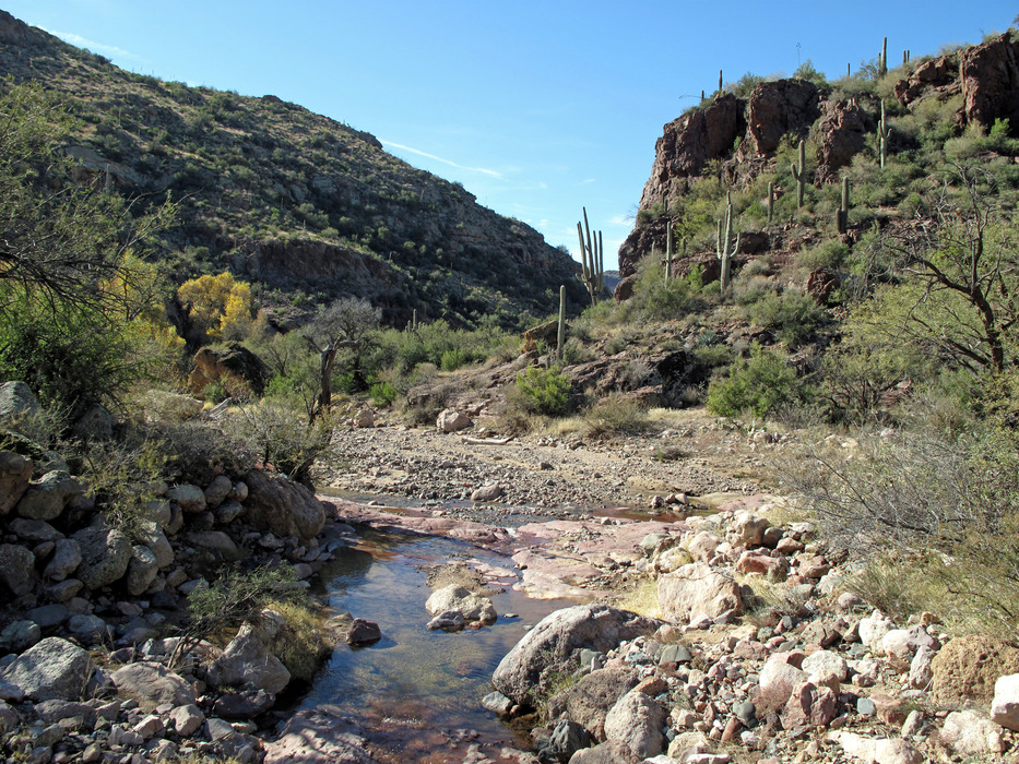 We have reached the intersection of Frasier Canyon-Coffee Flat TR#108 (straight) & Randolph Canyon-Red Tanks TR#107 (right turn); Dripping Springs resides just past that yellow cottonwood tree in the distance and TR#108 via Randolph Canyon continues past the yellow Cottonwood.