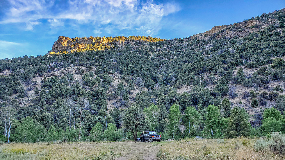 Dispersed camp site about a quarter mile from the trailhead. There were several dispersed camping sites along the drive up Soldier Creek but none offered shade. I made the best of a lone tree at this site and stretched a small tarp over the top of the car to give it some shade. It would get hot in the afternoon even at the 6700 ft elevation. I left the car here in the "shade" and started the hike from camp.