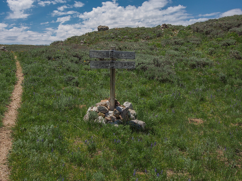 The sign marking the location of the spur trail leading to the Hidden Lakes. Note that the trail has not been used enough to wear a path through the grass - the first confirmation that the unmarked trail I had passed about 1.3 miles back was indeed a short cut to these lakes.