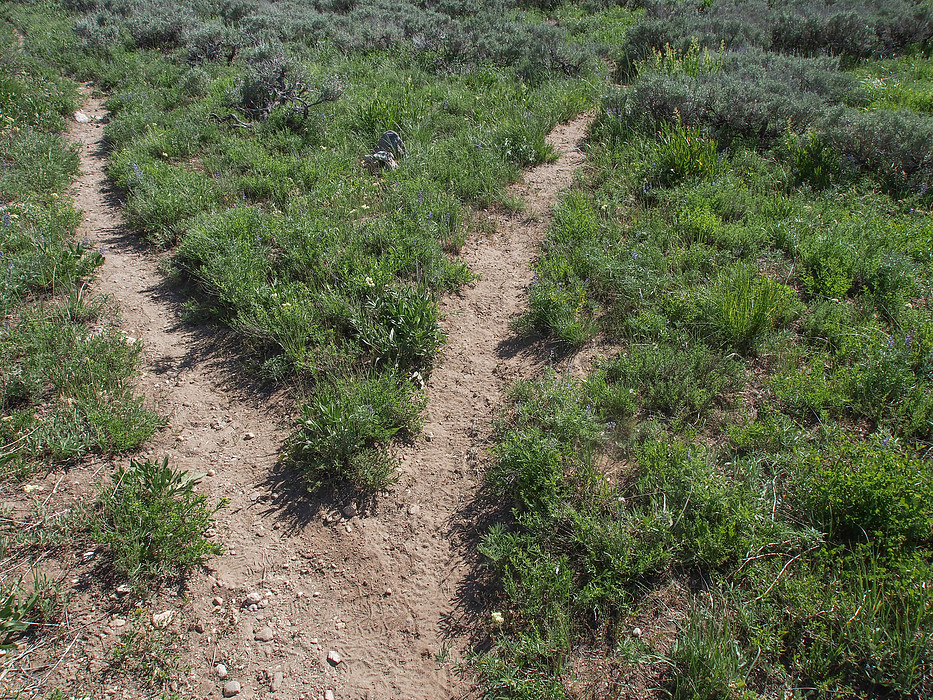 This well worn trail forked off to the right from the Soldier Basin Trail. I thought perhaps it was a shortcut to the Hidden Lakes but decided not to risk taking it. Checking Google Earth after returning home I see that it is so well used that it is clearly visible and is a shortcut to those lakes. The marked "official" side trail to those lakes was so un-used that I was only able to follow it using the rock cairns which marked its location. Obviously all the locals who frequent these trails know about the shortcut. The shortcut reduces the roundtrip distance by 2 miles.