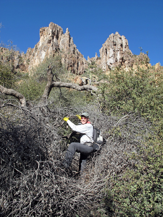 A "Grasshopper" in the bush!!; Here it was decision time: My two hiking partners Tom & Gary were starting to now look back and not forward; I had been waiting for this exploratory hike for two years and knew that I should not attempt it by myself; I jumped in front here and cut and pushed my way through knowing that IF I could just confirm another open area beyon this mess, that we would be good to go for another xx number of feet.. it worked!!