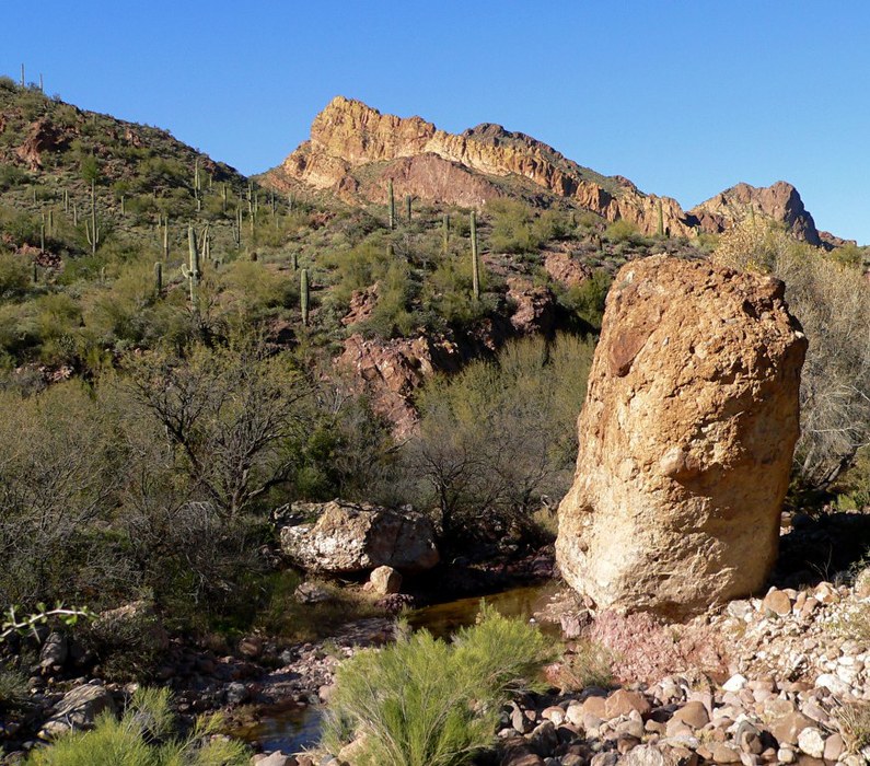 Here is a big huge boulder that has planted itself in the creek. The creek is gradually grating away at the base as you can see the red rock underneath the golden exterior. Well actually you can't see the red that well on this picture but I think it may show up on the Hackberry Loop pics when I post them.