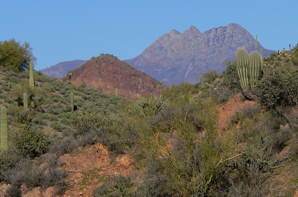 Here we have reached the saddle of a hill we had climbed and were making our way back to the horselot. Beautiful view of the Four Peaks and the twin saguaros. This is a zoom.