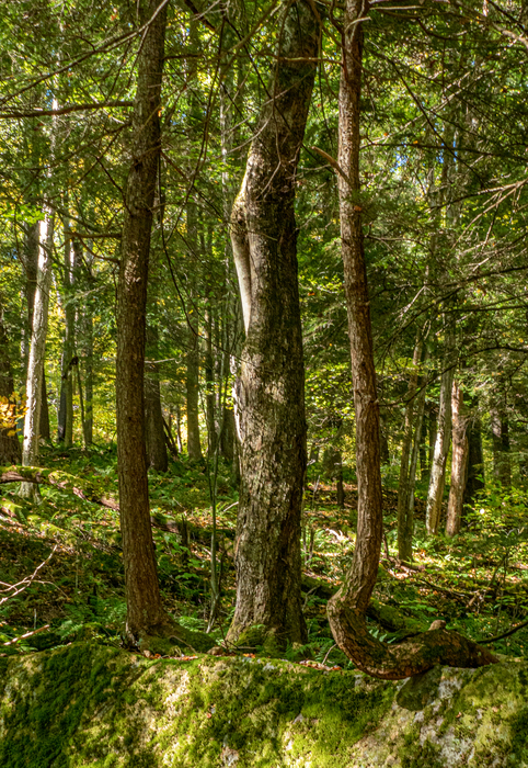 The thick forest in this section of the park, with nice shade. Lots of moss growth, and the shade here seems to have blocked out most undergrowth. The one tree to the right in the group of three didn't seem to get the memo on growing straight up.