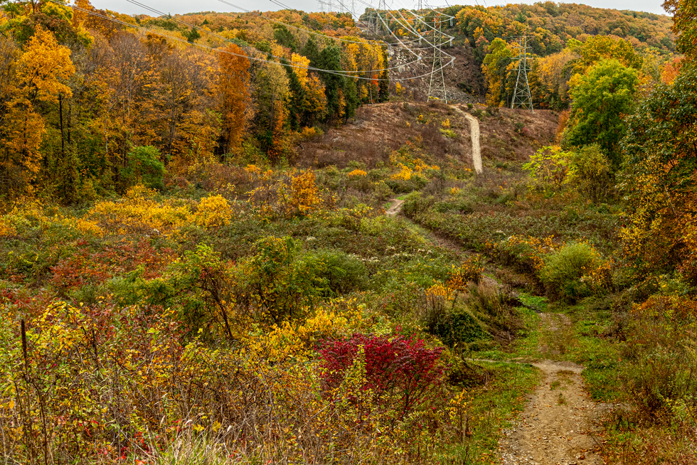 Better or worse? The clearing of the forest for the High Voltage transmission lines provides us with a grand vista of autumn color, but leaves an unnatural expanse of shrubs and undergrowth. Regardless though of our opinion our modern lives depend on the power delivered by this electrical distribution infrastructure.