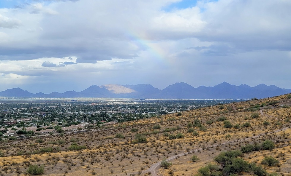 well it wasn't an intensely colored rainbow but it was fairly wide Looking east at the McDowells. The rainbow is Rainbow shooting off of McDowell/Drinkwater Peaks... always a nice memory of my hike with Kelly as she dragged me up those two peaks.